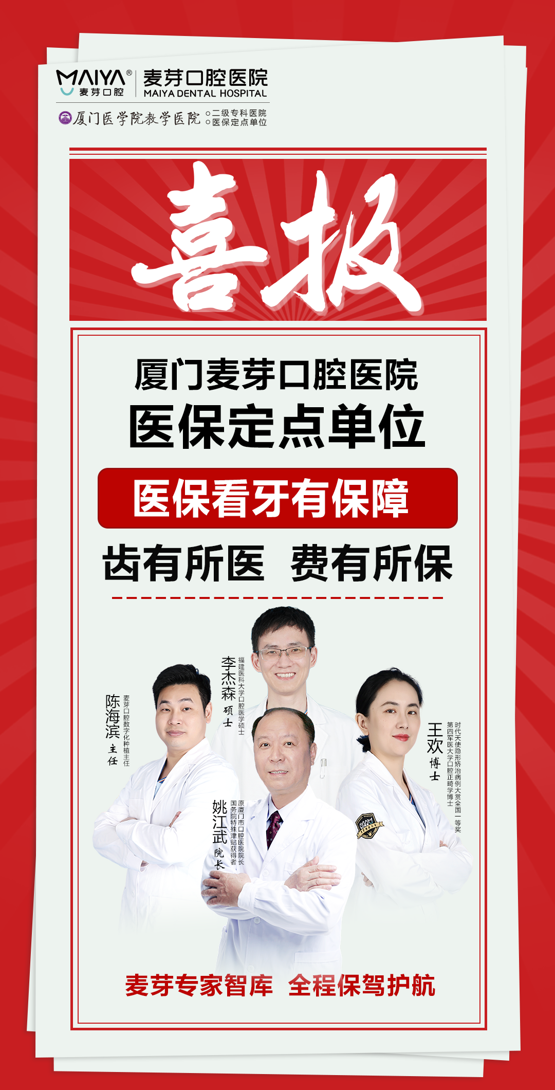 好消息:热烈庆祝厦门麦芽口腔医院纳入厦门市医保定点单位 此次获批“厦门市医保定点单位”是我院重视医疗质量和执行医保严格控费的结果,是一件惠民利民的好事,为市民带来便捷。 我院承诺将严格执行医疗保险各项规章制度,认真履行基本医疗保险服务协议,确保为参保人员提供合理、规范的医疗服务。发挥口腔专科特色与优势,积极走口腔疾病预防与治疗相结合的道路,努力为厦门及周边地区民众的口腔健康保驾护航! 医保更便捷 口腔健康是身体健康的决定性因素之一,爱牙护牙逐渐被当代人所重视。口腔健康的维护,除了正确的健康保健意识与方法,更离不开医生的专业医疗指导。 但是对于广大人民群众来说,考虑到高额的看牙费用,要么选择无视牙齿健康问题,要么选择一拖再拖,拖来拖去口腔健康甚至影响到其他疾病。 如今,您可以在麦芽口腔医院享受到医疗服务的同时,也可以享受医保带来的实惠与便捷!