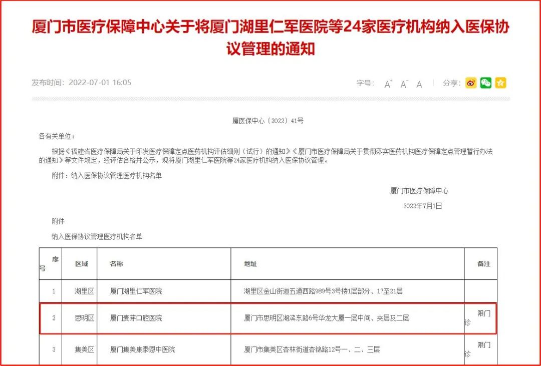 喜报丨厦门麦芽口腔医院纳入厦门市医保定点单位